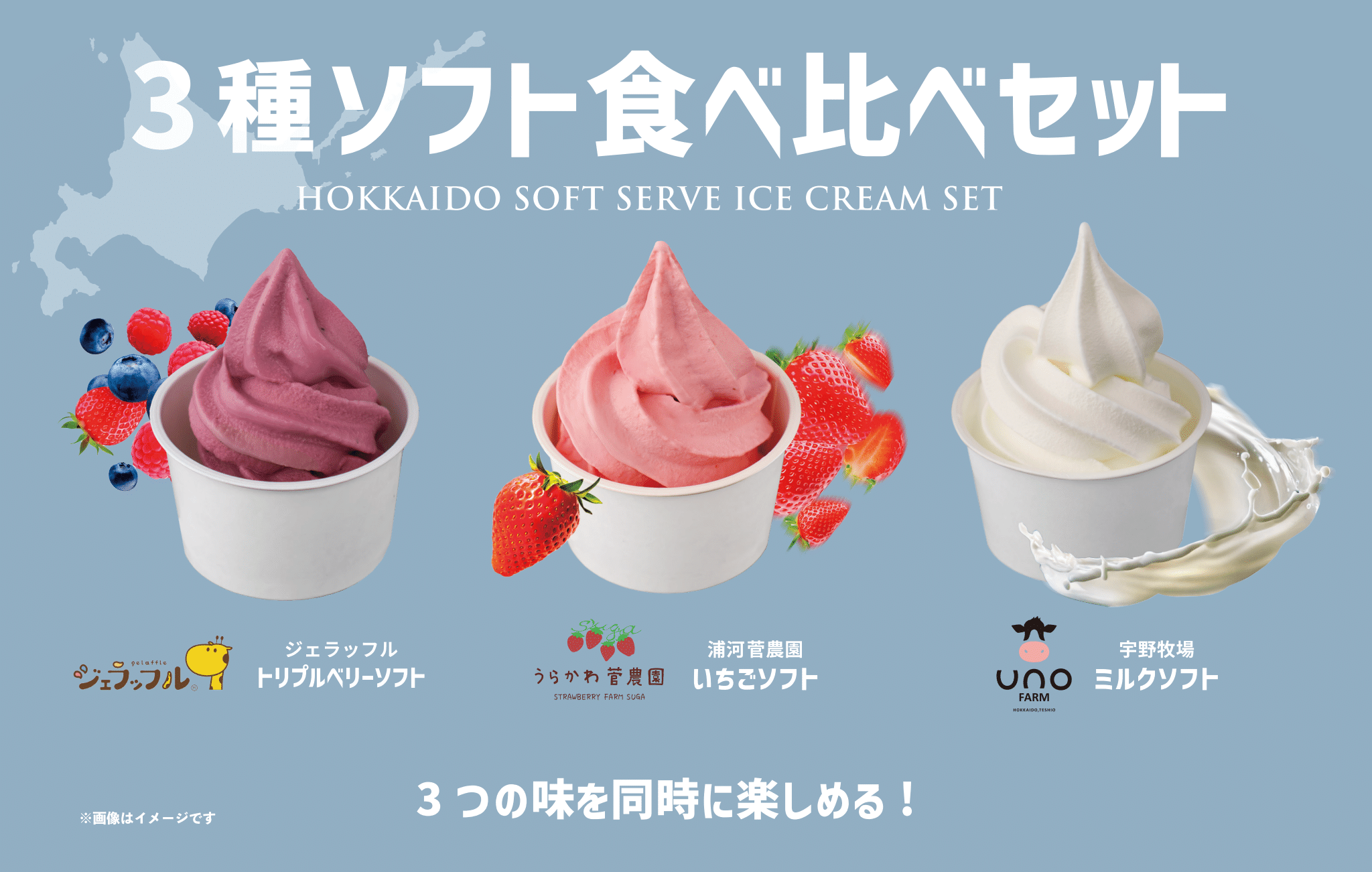 3種ソフト食べ比べセットにて、当園のいちごを使用したいちごソフトをぜひご賞味ください!
